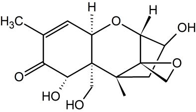嘔吐毒素主體成分為DON(deoxynivalenol, 脫氧雪腐鐮刀菌烯醇),屬于單端孢霉烯族化合物,主要由禾谷鐮刀菌、尖孢鐮刀菌、串珠鐮刀菌、擬枝孢鐮刀菌、粉紅鐮刀菌、雪腐鐮刀菌等鐮刀菌產(chǎn)生。另外,頭孢菌屬、漆班菌屬、木霉屬等的菌株都可產(chǎn)生該毒素。單端孢霉烯族毒素共有150多種,是一類強(qiáng)有力免疫抑制劑,所引起典型癥狀是采食量降低,所以這類毒素又叫飼料拒食毒素。嘔吐毒素(DON)是其中最重要一種毒素,主要來(lái)自鐮刀菌屬(Fusarium),尤其是禾谷鐮刀菌(Fusariumgraminearum)和黃色鐮刀菌(Fusarium culmorum)。由于它可以引起豬的嘔吐,故又名嘔吐毒素(vomitoxin,VT)。由于它可以引起豬的嘔吐而得名,對(duì)人體有一定危害作用,歐盟分類標(biāo)準(zhǔn)為三級(jí)致癌物。
