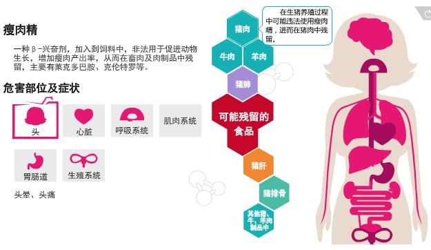 人食用含殘留鹽酸克倫特羅豬肉后對肝、腎等內(nèi)臟器官會產(chǎn)生毒害作用,出現(xiàn)心悸、頭痛、目眩、惡心、嘔吐、心率加快、肌肉振顫等癥狀,特別是對高血壓、心臟病、甲亢和前列腺肥大等疾病患者危害更大,嚴(yán)重的可導(dǎo)致死亡。