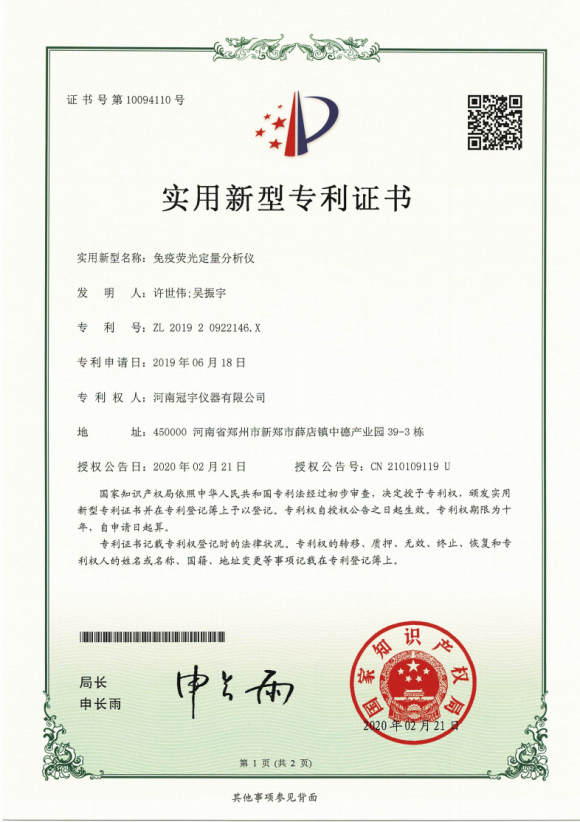 近日,河南冠宇儀器有限公司(以下簡稱:冠宇儀器)繼之前的多項軟件著作權(quán)證書及專利證書之后,又獲由中華人民共和國國家版權(quán)局頒發(fā)的一項“免疫熒光定量分析儀實用新型專利證書”,一系列的權(quán)威肯定,彰顯了冠宇儀器強大的技術(shù)研發(fā)能力,也體現(xiàn)出公司為客戶提供優(yōu)質(zhì)產(chǎn)品的強大決心。