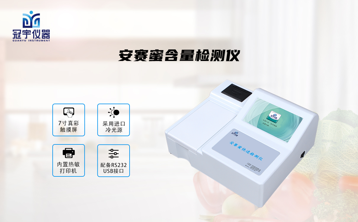 4.綜上預防措施中,都需要一款專用的檢測儀器來檢控食品生產(chǎn)中及成品食品的安賽蜜含量,來具體判定是否超標,用以避免過量攝入。冠宇儀器安賽蜜含量檢測儀GY-SASM10能夠快速檢測蜜餞、果醬、糖果、面包糕點、飲料等中的安賽蜜含量。