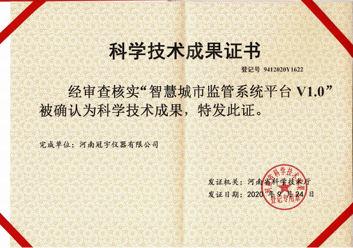 河南冠宇儀器有限公司(以下簡稱:冠宇儀器)繼多項軟件著作權(quán)證書、實用新型專利證書、計算機軟件著作權(quán)等一系列證書之后,又獲由河南省科學(xué)技術(shù)廳頒發(fā)的一項“智慧城市監(jiān)管系統(tǒng)平臺V1.0科學(xué)技術(shù)成果證書”,一系列的權(quán)威肯定,彰顯了冠宇儀器強大的技術(shù)研發(fā)能力,也體現(xiàn)出公司為客戶提供優(yōu)質(zhì)產(chǎn)品的強大決心。