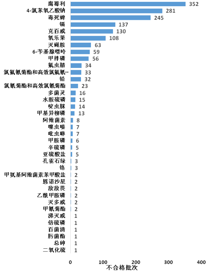 腐霉利、4-氯苯氧乙酸鈉、毒死蜱等農(nóng)藥殘留超標(biāo)為蔬菜產(chǎn)品抽檢主要不合格項(xiàng)。其中腐霉利殘留超標(biāo)352批次,全部從韭菜中檢出;4-氯苯氧乙酸鈉殘留超標(biāo)281批次,主要從黃豆芽、綠豆芽中檢出;毒死蜱殘留超標(biāo)245批次,主要從芹菜、普通白菜中檢出。從蔬菜上禁用農(nóng)藥檢出情況看,排在前五位的包括:毒死蜱,檢出245批次;克百威,檢出130批次;氧樂果,檢出108批次;甲拌磷,檢出56批次;氟蟲腈,檢出34批次(詳見圖1)。