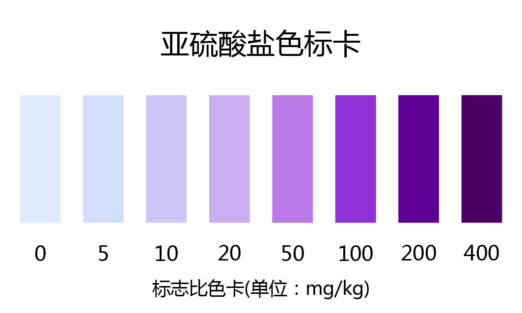 2.1:2分鐘后觀察檢測管中顏色的深淺,紫紅色顏色越深,表示樣品中亞硫酸鹽的含量越高。