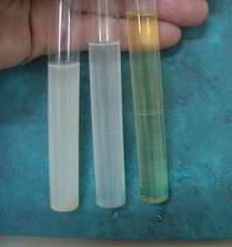 2.3:混有礦物油時(shí)久放析出透明油滴浮于液面。